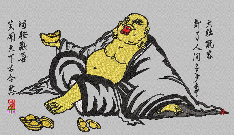 弥勒佛EMB,DST贴布绣花花样免费下载,笑口常开的胖和尚为特征,象征宽容、包容与乐达豁朗的精神‌。